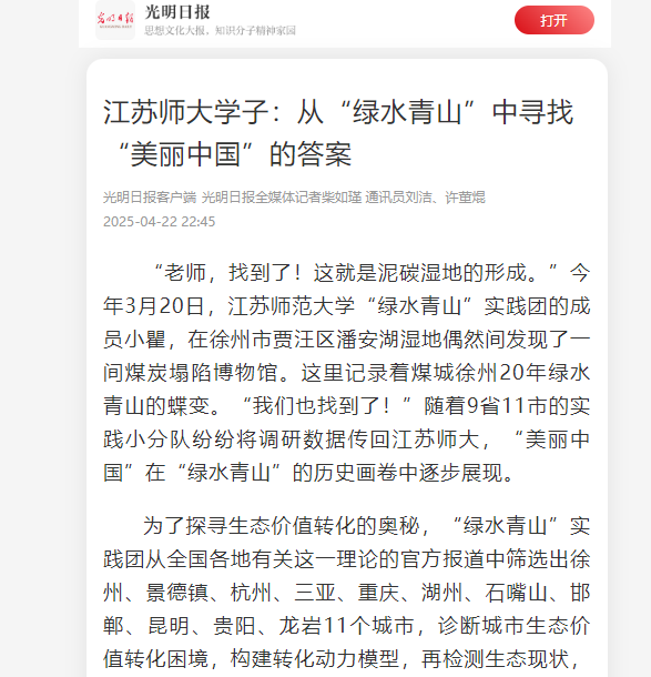 “老師,找到了!這就是泥碳濕地的形成。”今年3月20日,江蘇師范大學“綠水青山”實踐團的成員小瞿,在徐州市賈汪區潘安湖濕地偶然間發現了一間煤炭塌陷博物館。這里記錄著煤城徐州20年綠水青山的蝶變。“我們也找到了!”隨著9省11市的實踐小分隊紛紛將調研數據傳回江蘇師大,“美麗中國”在“綠水青山”的歷史畫卷中逐步展現。