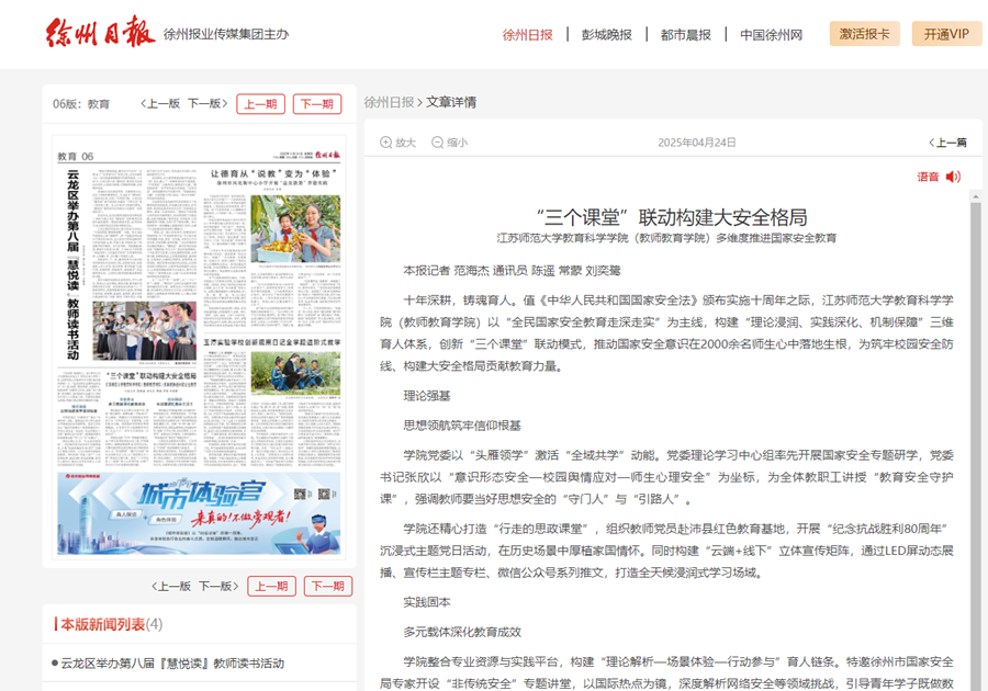 徐州日報4月24日報道我校教育科學學院(教師教育學院)國家安全教育工作經驗,報道內容如下: