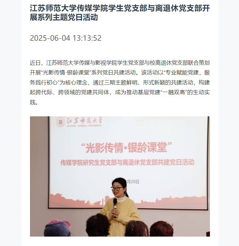 近日,江蘇師范大學傳媒與影視學院學生黨支部與校離退休黨支部聯合策劃開展“光影傳情·銀齡課堂”系列黨日共建活動。該活動以“專業賦能黨建,服務踐行初心”為核心理念,通過三期主題鮮明、形式新穎的共建活動,構建起跨代際、跨領域的黨建共同體,成為推動基層黨建“一融雙高”的生動實踐。