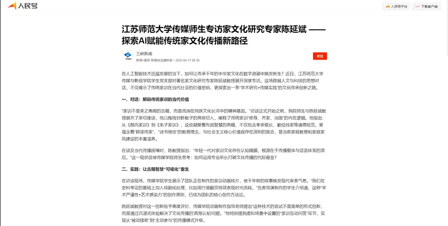 在人工智能技術迅猛發展的當下,如何讓傳承千年的中華家文化在數字浪潮中煥發新生?近日,江蘇師范大學傳媒與影視學院學生黨支部對著名家文化研究專家陳延斌教授展開深度專訪。這場跨越人文與科技的思想對話,不僅揭示了傳統家訓在當代社會的價值密碼,更探索出一條“學術研究+傳媒實踐”的文化傳承創新之路。