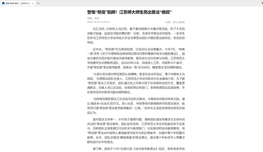 近年來,“幫信罪”作為典型輕罪,已成為社會治理重點。今年7月,“兩高一部”發布《關于辦理幫助信息網絡犯罪活動等刑事案件有關問題的意見》,指出辦案機關應積極開展法治宣傳教育,推動全社會共同參與治理。江蘇師范大學組建學生志愿服務團隊,自2023年以來,持續深入江蘇、河南等10個省市,開展“幫信罪”普法宣傳教育,探索出一條“多元協同、精準普法”的治理新路徑。