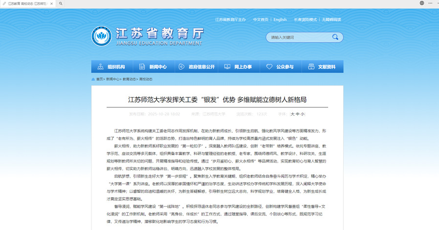 江蘇省教育廳官方網站10月28日關注我校發揮關工委“銀發”優勢,多維賦能立德樹人新格局工作經驗,內容如下: