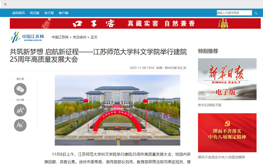 中國江蘇網11月8日報道科文學院舉行建院25周年高質量發展大會,報道內容如下: