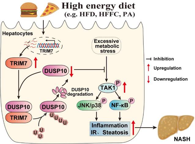 隨著居民生活方式的改變與高脂肪飲食攝入的增加,非酒精性脂肪性肝病(NAFLD,現(xiàn)又稱為代謝功能障礙相關(guān)脂肪性肝病 MASLD)已成為全球發(fā)病率最高的慢性肝臟疾病。其疾病譜涵蓋單純性脂肪肝、非酒精性脂肪性肝炎(NASH),并可進展為 NASH 相關(guān)肝纖維化、肝硬化甚至肝細胞癌。流行病學數(shù)據(jù)顯示,過去十年間,NAFLD/NASH 已成為全球肝癌病因中增長最快的類型。然而截至目前,全球范圍內(nèi)僅一款藥物獲批上市,且存在患者應答率低、價格昂貴等問題,難以滿足臨床需求。深入解析疾病發(fā)病機制、挖掘新型治療靶點,已成為該領(lǐng)域亟待突破的關(guān)鍵方向。該研究團隊通過一系列體內(nèi)外實驗發(fā)現(xiàn):E3 泛素連接酶三基序蛋白 7(TRIM7)可通過泛素化修飾介導 DUSP10 蛋白降解,進而激活 TAK1 信號通路及其下游級聯(lián)反應促進肝臟脂肪變性、炎癥反應加劇及胰島素抵抗發(fā)生,最終推動 NAFLD 的疾病進展;該研究明確了 “TRIM7-DUSP10 軸” 作為 NAFLD 治療靶點的巨大潛力,為開發(fā)新型靶向藥物提供了新的理論依據(jù)與實驗基礎(chǔ)。