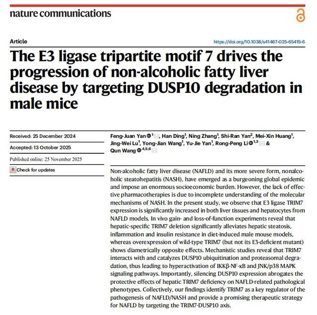生命科學學院閆鳳娟團隊在SCI期刊《Nature Communications》(一區(qū)TOP)發(fā)表題為 “The E3 ligase tripartite motif 7 drives the progression of non-alcoholic fatty liver disease by targeting DUSP10 degradation in male mice” 的研究論文。