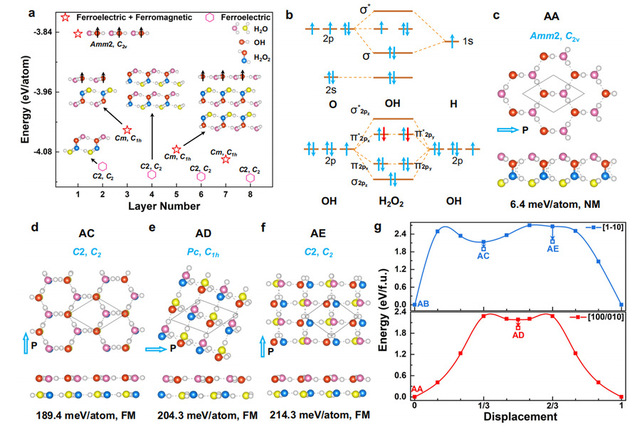 多鐵性材料是指在單相材料中同時具備兩種或兩種以上可切換序參量(如鐵磁性、鐵電性、鐵彈性等)的材料,因其在存儲與邏輯器件等領(lǐng)域的應用潛力而受到廣泛關(guān)注。然而,該領(lǐng)域仍面臨一個關(guān)鍵性挑戰(zhàn):如何有效調(diào)控磁性相變。早在2020年,該團隊首次在第一類二維多鐵材料中提出了通過電場調(diào)控磁相變的策略,揭示了電控磁性的獨特機制[Phys. Rev. Lett. 124, 067602 (2020)]。然而,探索二維多鐵材料磁性調(diào)控新策略并揭示其新機制仍然是該領(lǐng)域的關(guān)鍵性科學問題。基于電子配對的基本原理,該團隊提出了一種通過層間堆疊或滑移調(diào)控磁性相變新策略。采用吉林大學馬琰銘院士團隊自主研發(fā)的CALYPSO晶體結(jié)構(gòu)預測技術(shù)并結(jié)合第一性原理計算方法,預言了一種新型二維分子鐵電材料——水-羥基(H2O-OH)單層結(jié)構(gòu)。在該單層結(jié)構(gòu)中,鐵磁性起源于OH基團2p成鍵軌道上的未配對電子。因此,通過調(diào)控層間結(jié)構(gòu),可實現(xiàn)磁性的可逆切換:一方面,層間堆疊促進H2O2分子形成,使未配對電子配對,從而誘導鐵磁性向非磁性轉(zhuǎn)變;另一方面,層間滑移抑制H2O2分子形成,恢復未配對電子,從而實現(xiàn)非磁性向鐵磁性轉(zhuǎn)變。此外,這一磁相變過程可被外加電場有效調(diào)控。重要的是,受該理論研究指導,中國科學院物理研究所馮寶杰教授等人采用低能電子輔助合成方法首次在Ag(111)表面合成了H2O–OH單層到多層結(jié)構(gòu)。這項工作為二維鐵電材料中磁性的有效調(diào)控提供了全新思路,拓展了多鐵材料設(shè)計與應用的可能性。