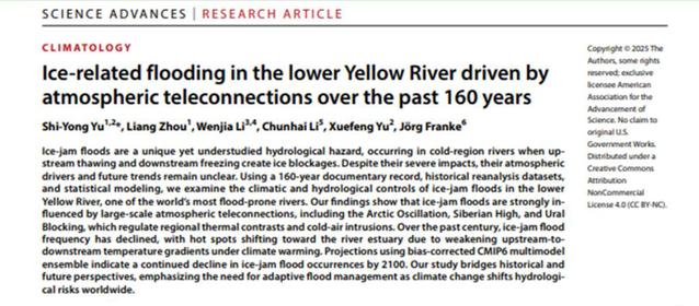 地理測繪與城鄉(xiāng)規(guī)劃學院于世永團隊在SCI期刊《Science Advances》(一區(qū)TOP)發(fā)表題為“Ice-related flooding in the lower Yellow River driven by atmospheric teleconnections over the past 160 years”的文章,系統(tǒng)揭示了黃河下游凌汛洪水在過去160年中的時空演變規(guī)律及其對全球變暖的響應機制。這一研究不僅為寒區(qū)河流洪水管理提供了全新的理論框架,還為相關(guān)政策制定和防災減災工作提供了重要科學依據(jù)。