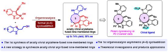 軸手性分子廣泛存在于天然產(chǎn)物、生物活性分子、手性催化劑及配體、功能材料中。因此,軸手性分子的催化不對稱合成已經(jīng)成為一個重要的研究領(lǐng)域。軸手性芳環(huán)并中環(huán)是一類重要的軸手性分子,但是由于這類骨架的構(gòu)筑既需要克服軸手性分子易消旋、骨架剛性的問題,又要應對中環(huán)構(gòu)建中不利的熵效應、跨環(huán)張力,軸手性芳環(huán)并中環(huán)的催化不對稱構(gòu)筑極具挑戰(zhàn)性。該成果發(fā)展了3-乙炔基-2-吲哚甲醇與2-吲哚乙醇的催化不對稱形式(4+5)環(huán)加成反應,克服了軸手性芳環(huán)并中環(huán)不易構(gòu)筑的問題,首次實現(xiàn)了軸手性乙烯基吲哚并九元環(huán)的高效構(gòu)筑。這類新型軸手性分子不僅對人體前列腺腫瘤細胞PC-3具有較強的抑制作用,還可以通過簡單的修飾轉(zhuǎn)化成手性配體,在藥物化學及手性催化劑開發(fā)方面都具有潛在的應用前景。此外,他們還通過理論計算,深化了對催化不對稱形式(4+5)環(huán)加成反應的理解。