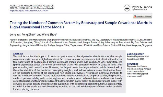 數(shù)學與統(tǒng)計學院趙鵬團隊在SCI期刊《Journal of The American Statistical Association》(一區(qū)TOP)發(fā)表了題為“Testing the Number of Common Factors by Bootstrapped Sample Covariance Matrix in High-Dimensional Factor Models”的文章,旨在利用隨機矩陣理論研究如何確定高維因子模型的公共因子數(shù)量這一基本統(tǒng)計學問題。