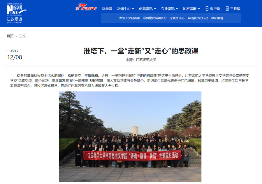 新華網江蘇頻道12月8日關注發表馬克思主義學院把行走的思政課搬進淮塔的工作經驗,內容如下: