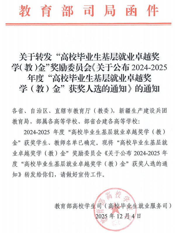近日,教育部公布2024-2025年度“高校畢業生基層就業卓越獎學(教)金”獲獎名單,我校馬克思主義學院王本賢老師成功入選,是我校教師首次獲此殊榮,實現了新的突破。