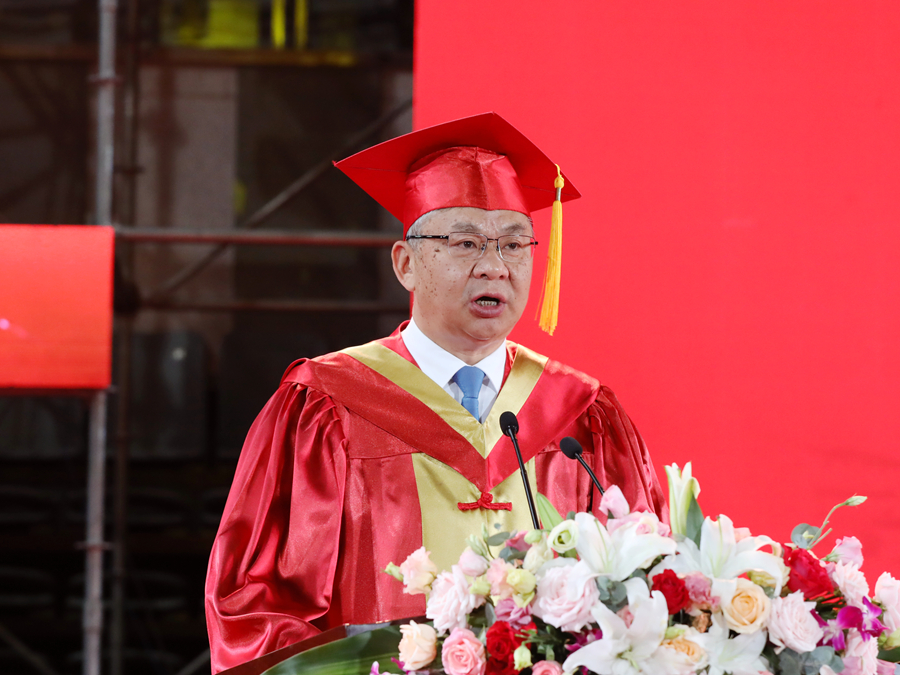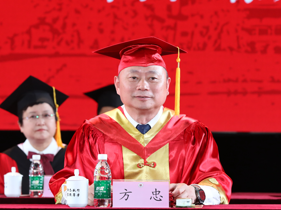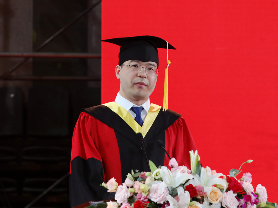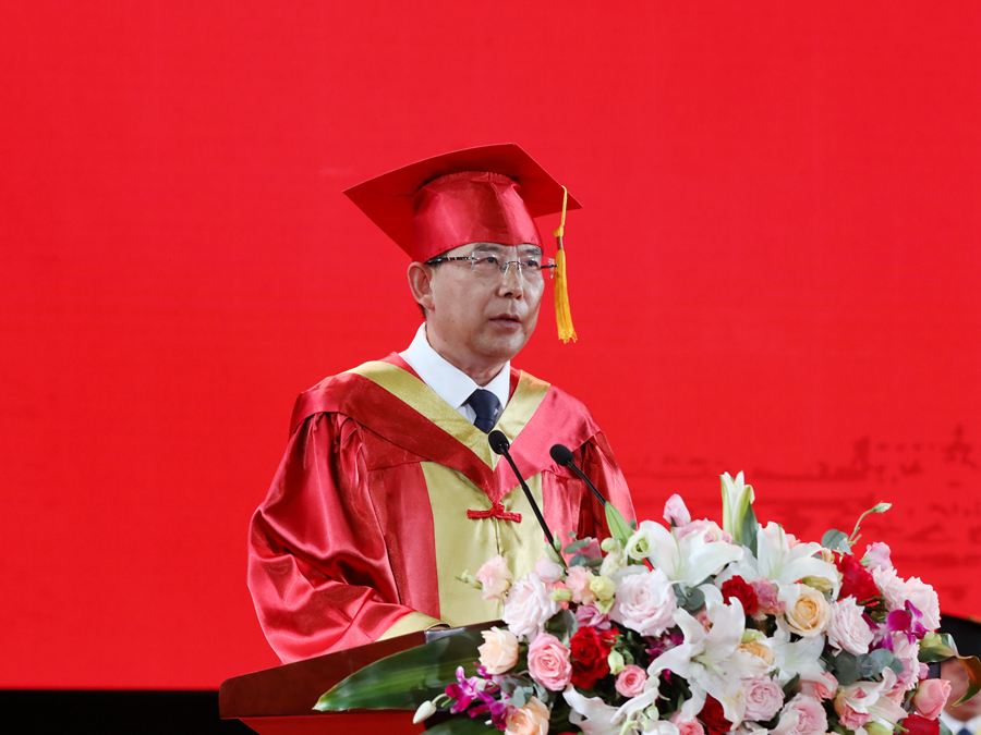 伴隨著莊嚴的國歌聲,畢業典禮正式開幕。校長、校學位評定委員會主席周汝光在典禮上致辭,代表學校向圓滿完成學業的畢業生們表示熱烈祝賀,向辛勤培育、陪伴支持畢業生的老師和家長致以衷心感謝。周汝光以“擦亮青春底色,唱響時代之音”為題,飽含深情地回顧了全體畢業研究生在讀期間取得的成績,充分肯定了大家在疫情防控期間與學校息息相通,甘苦與共,用實際行動關注支持學校事業發展作出的努力。他寄語全體畢業研究生,生逢偉大時代,不僅要學有所成,更要學有所思、學有所用,做持之以恒的自律者、堅韌不拔的奮斗者、矢志不渝的愛國者。周汝光勉勵全體畢業研究生要傳承好“崇德厚學,勵志敏行”的校訓,心中有陽光,腳下有力量,篤行致遠、惟實勵新,不墜青云之志,創造無愧于時代的精彩人生。