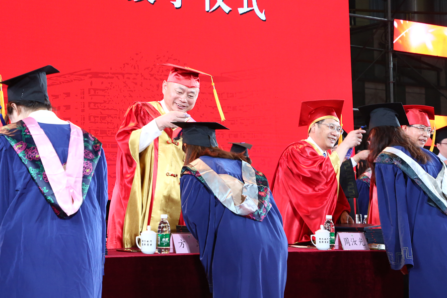 副校長、校學位評定委員會副主席蔡國春宣讀學位授予決定。校領導、校學位評定委員會委員為全體2023屆畢業研究生正冠撥穗并頒發學位證書。