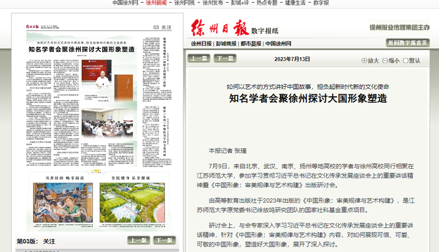 徐州日報7月13日報道我校舉辦的學習貫徹習近平總書記在文化傳承發展座談會上的重要講話精神暨《中國形象:審美規律與藝術構建》出版研討會,報道內容如下: