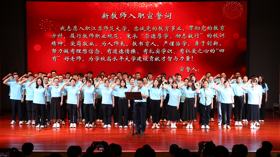 白手起梁溪風(fēng)雨兼程弦歌不輟,丹青開錦卷德才并重理念常新。一代代江蘇師大人攜手并進(jìn),接續(xù)傳承著精神的火炬。每一年總有一批新鮮的血液注入江蘇師大的教師隊(duì)伍。大會上,新入職教師進(jìn)行了入職宣誓。表彰大會在青年教師們的鏗鏘誓詞中落下帷幕。