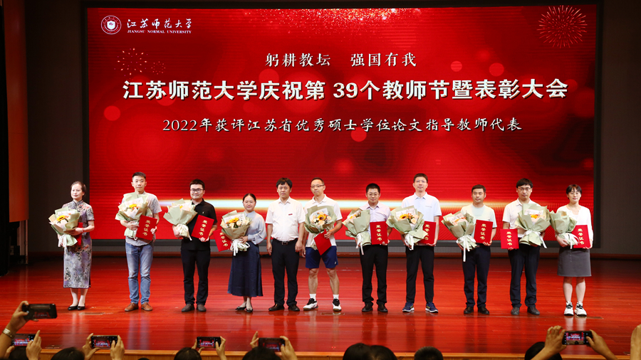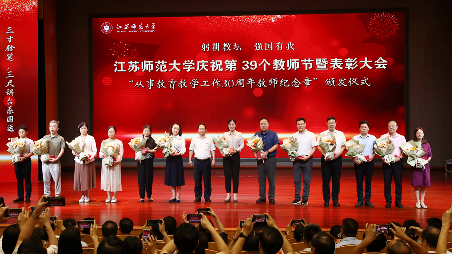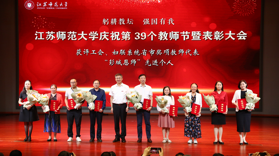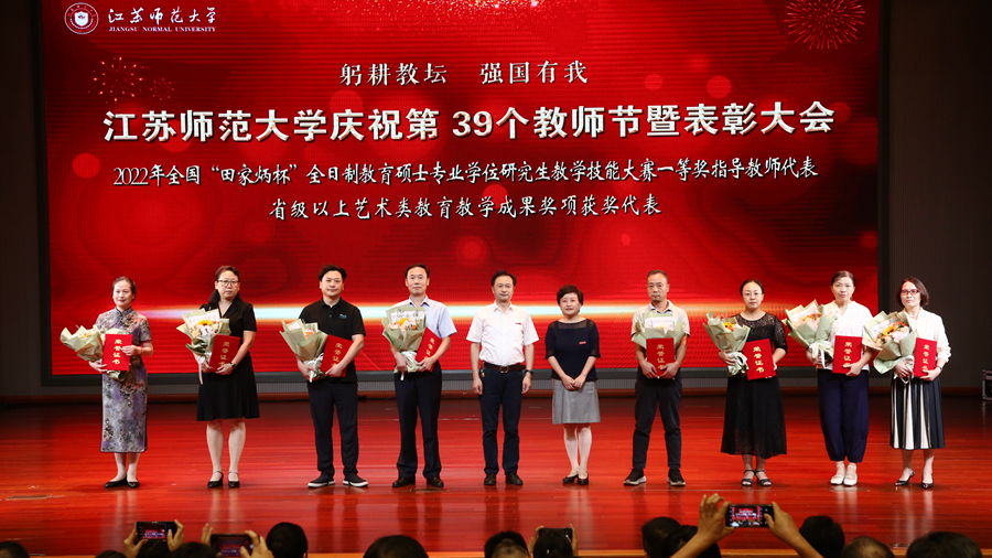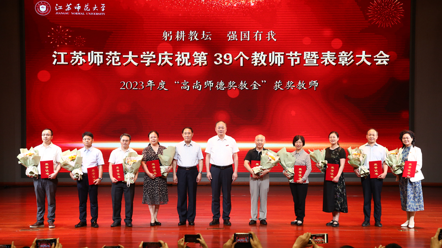 步錦昆代表江蘇省教育基金會講話,向工作在教育事業(yè)一線的廣大教職工致以節(jié)日問候和誠摯感謝,向獲得表彰的集體和個人表示熱烈祝賀。他表示,習(xí)近平總書記關(guān)于教育的重要論述,為全面深化新時代教師隊(duì)伍建設(shè)、推動大學(xué)高質(zhì)量發(fā)展提供了根本遵循。省教育基金會在高校設(shè)立“高尚師德獎教金”,旨在弘揚(yáng)中華民族優(yōu)秀傳統(tǒng)美德,助力學(xué)校加強(qiáng)師德師風(fēng)建設(shè)。衷心希望江蘇師范大學(xué)的全體老師以受表彰的老師為榜樣,不忘初心、牢記使命,愛崗敬業(yè)、教書育人,修身崇德、砥礪前行,努力做“有理想信念、有道德情操、有扎實(shí)學(xué)識、有仁愛之心”的“四有”好老師和做“學(xué)生錘煉品格、學(xué)習(xí)知識、創(chuàng)新思維、奉獻(xiàn)祖國”的“四個引路人”。