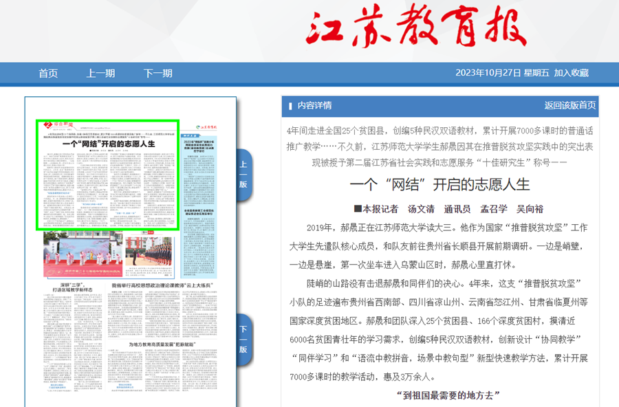 江蘇教育報10月27日報道我校學生郝晟同學的推普脫貧攻堅和支教實踐事跡,報道內容如下: