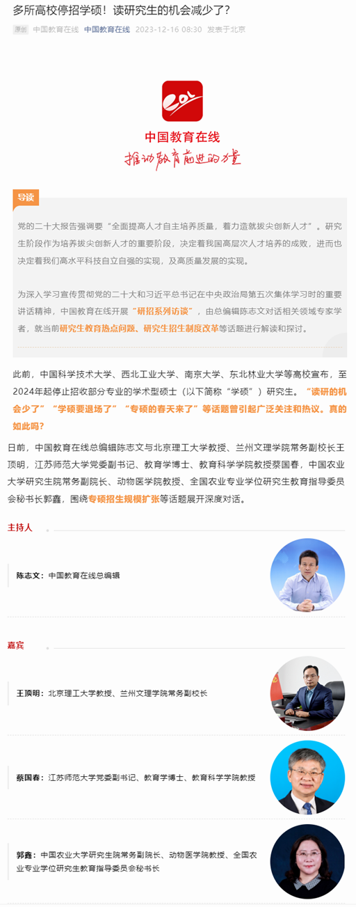 2023年12月16日中國教育在線以“多所高校停招學碩!讀研究生的機會減少了?”為題,綜合采訪我校黨委副書記蔡國春等知名教育專家,談研究生招生政策。報道內容如下: