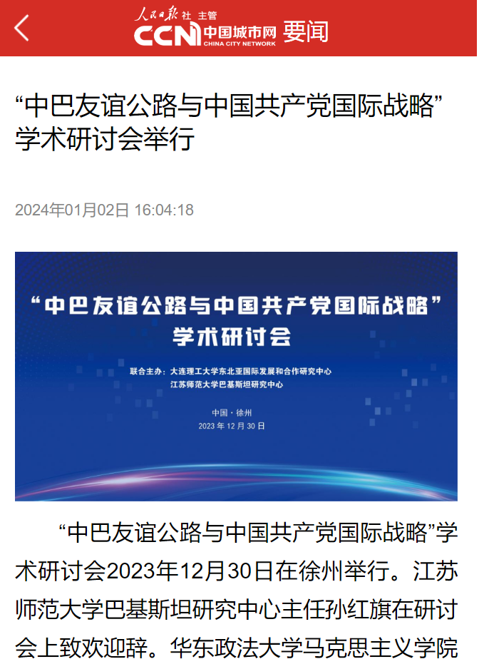 中國城市網2024年1月2日報道在我校舉辦的“中巴友誼公路與中國共產黨國際戰略”學術研討會,報道內容如下: