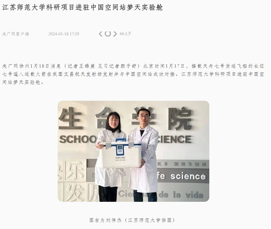 1月19日央廣網(wǎng)報(bào)道我校劉偉杰教授團(tuán)隊(duì)研究成果入駐空間站,報(bào)道內(nèi)容如下: