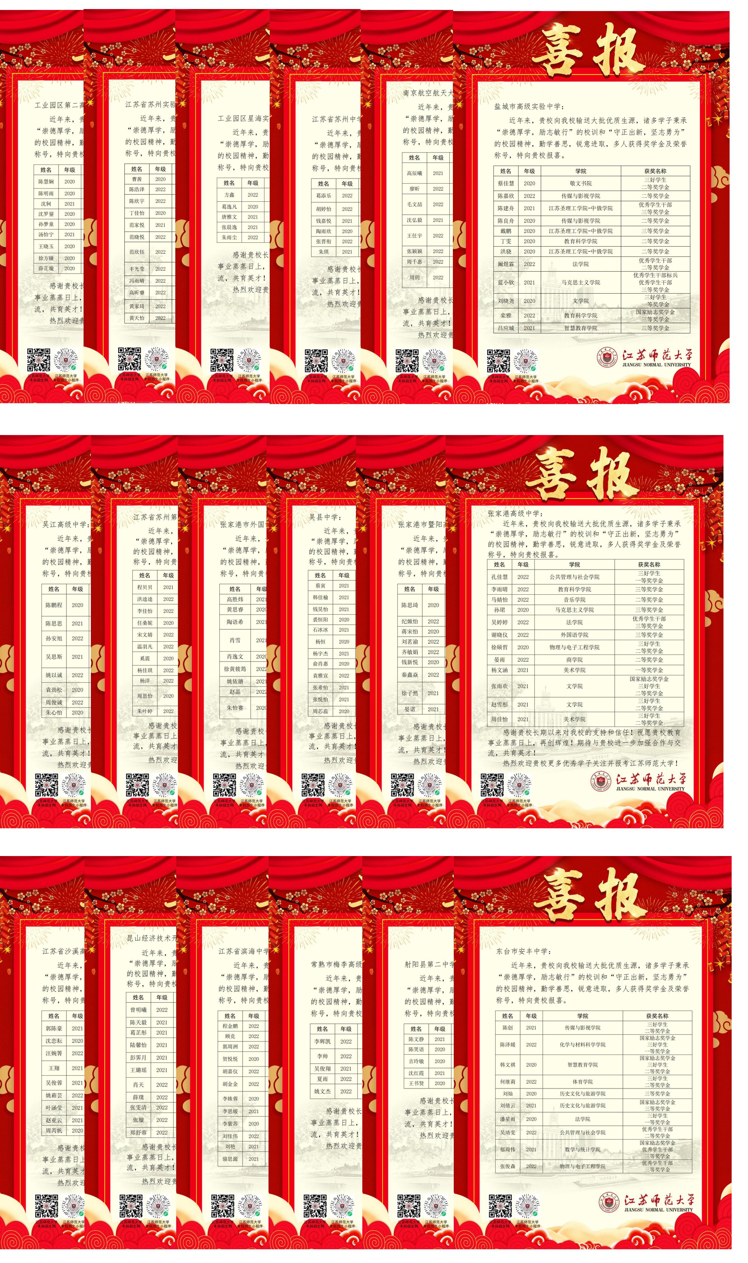 為感謝各中學(xué)為我校輸送優(yōu)質(zhì)生源,以及鼓勵(lì)更多優(yōu)質(zhì)生源報(bào)考我校,近日,校本科招生辦對我校2022-2023學(xué)年獲得校級及以上三好學(xué)生、優(yōu)秀學(xué)生干部、獎(jiǎng)學(xué)金的本科學(xué)生名單進(jìn)行了整理,并以喜報(bào)的形式陸續(xù)發(fā)送給各自畢業(yè)中學(xué)。目前已發(fā)送完第一批喜報(bào),共涉及蘇州、鹽城等多個(gè)市50所中學(xué),得到了中學(xué)的熱烈回應(yīng),產(chǎn)生了積極的社會(huì)反響。