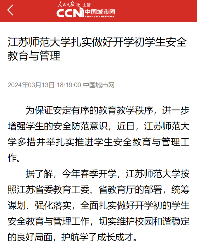 據(jù)了解,今年春季開(kāi)學(xué),江蘇師范大學(xué)按照江蘇省委教育工委、省教育廳的部署,統(tǒng)籌謀劃、強(qiáng)化落實(shí),全面扎實(shí)做好開(kāi)學(xué)初的學(xué)生安全教育與管理工作,切實(shí)維護(hù)校園和諧穩(wěn)定的良好局面,護(hù)航學(xué)子成長(zhǎng)成才。