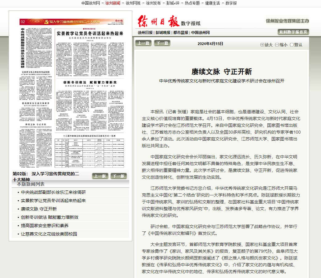 4月15日,徐州日報報道在我校舉辦的中華優秀傳統家文化與新時代家庭文化建設學術研討會,報道內容如下: